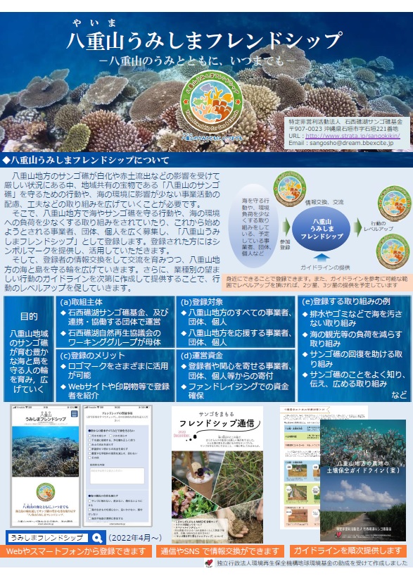 石西礁湖サンゴ礁基金では、石西礁湖自然再生協議会(事務局:環境省)のワーキングメンバーと一緒に、「八重山うみしまフレンドシップ」の制度を検討してきました。この4/1からキックオフしています。
